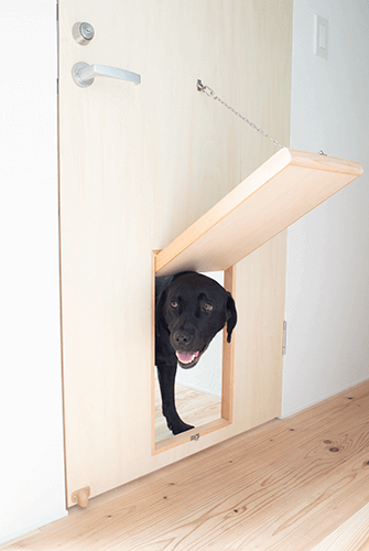 正子さん そうです。とにかく家を建てる基本がワンちゃんのためというのがあったので、事務所と家を行き来できるように、ドアの下の部分に大型犬1匹が通れるくらいの扉をつけて自由に行き来させてます。