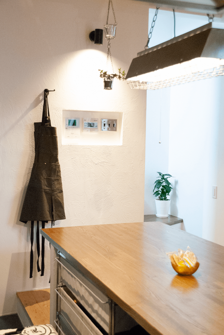 彩さん はい、かなり。玄関に取り付けた黒板の大きさとか、シューズクロークの幅や高さとかまでは細かくは決めてなくて…。実際にそこに取り掛かかりはじめて、上杉さんと長浜さんがメジャーで測りながら「こんな感じ?」を繰り返して一緒に作ってくれました。引き渡しが終わったあともエプロンをかけるフックをつけるのも、時計をつけるのも手伝ってくれたんです。