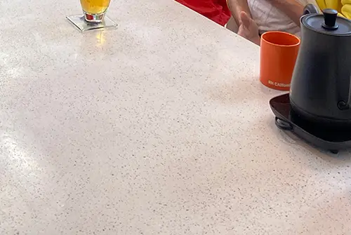 夕輝さん このテーブルの製作は左官職人さんにお願いしたらしいのですが、前例がなかったらしく手探りでやってくださいました。納得のいく色みになるまで直していただいて、3回ほど仕上がりのサンプルをやり替えてもらって、ようやく希望のテイストに仕上がりました。