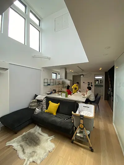 藍さん 敷地面積は35坪と狭いですが、めいっぱい敷地を使った造りになっています。天井が高いので、リビングは特に開放感があるかもしれません。