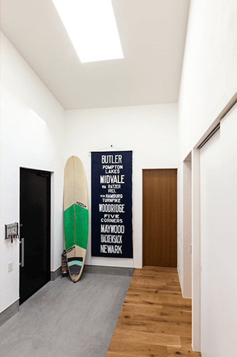 廉浩さん はじめて玄関に入った時「あかるーい!!!」って(笑)。とくに僕は玄関にこだわりたかったんです。今、玄関に入ってすぐサーフボードがあるじゃないですか。パッと入れて置けるっていう便利さがたまりません。