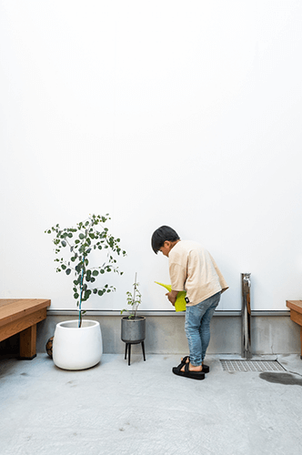 千晶さん お店とプライベートの境界線をしっかり区切るのは一番の希望だったんですけど、同時に庭も欲しかったんです。でもよくある定番の「庭」だと丸見えになっちゃって、「家感」がすごく出ちゃうけど、中庭だったら子どもがスッポンポンでプールに入っても気にならない。窓を閉めきってもどこからでも見えるので、夏は安心して部屋のなかでコーヒーを飲みながら見守ってました(笑)。