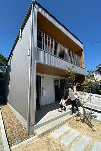 愛さんが兼ねてからこだわっていた、ガルバリウムのシルバーを採用した外壁、見事に起用されたんですね。木目との組み合わせがすっきりしていて、いい感じですね。